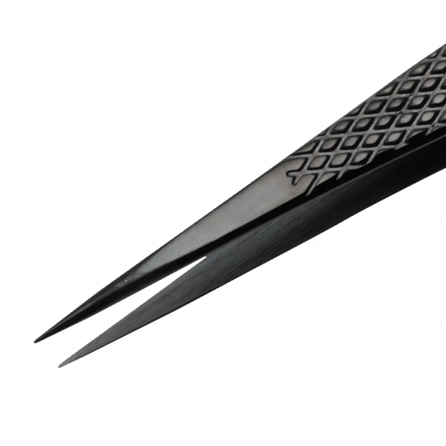 The tweezer's elegant black finish is achieved through a sophisticated Physical Vapor Deposition (PVD) process, which fuses a durable Titanium Carbide coating to the surface. This advanced technique not only enhances the aesthetic appeal but also imparts superior scratch and corrosion resistance, ensuring the tweezer's longevity and reliability.