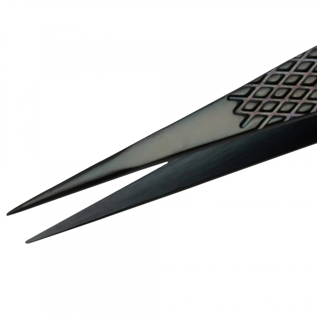 The tweezer's elegant black finish is achieved through a sophisticated Physical Vapor Deposition (PVD) process, which fuses a durable Titanium Carbide coating to the surface. This advanced technique not only enhances the aesthetic appeal but also imparts superior scratch and corrosion resistance, ensuring the tweezer's longevity and reliability.