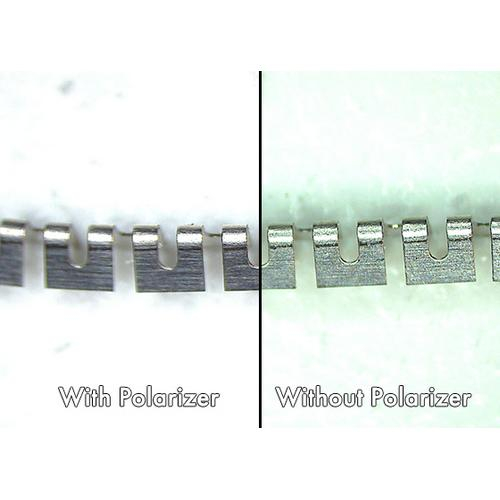 Aven’s LED Ring Light with Adjustable Polarizer significantly reduces the glare from shiny objects, allowing operators to see details that could otherwise be obscured or washed out. Features a polarizer dial with reference markers to adjust the level of polarization. Includes a tinted glass analyzer insert for enhanced polarization effects.