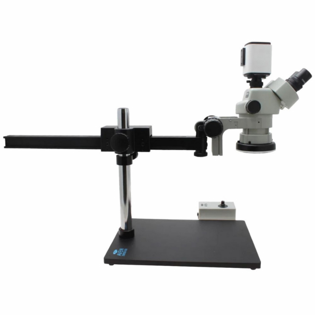 This gliding arm stand with a heavy metal base is an excellent device for inspection applications that require magnification adjustment and the ability to move easily across a specimen.