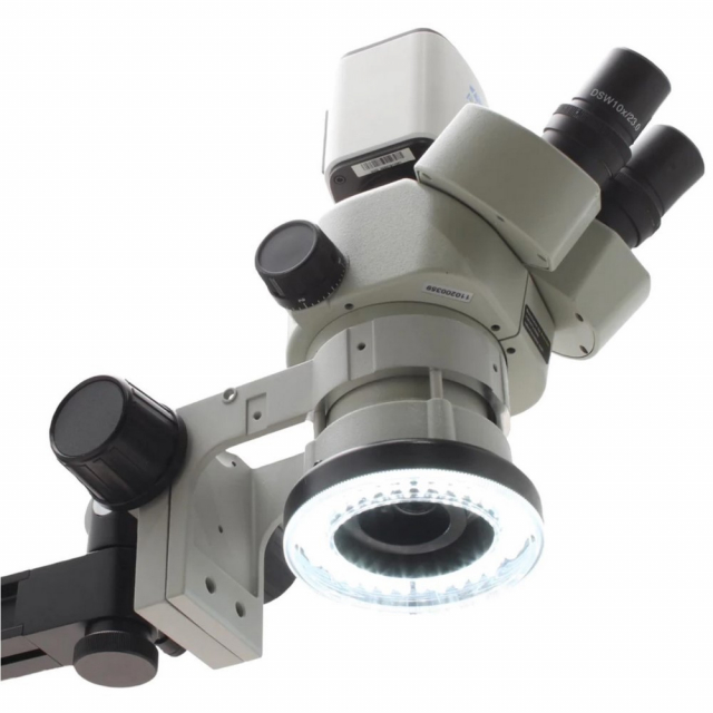 This focus mount features an LED ring light with 60 adjustable LEDs. The course adjustment knobs on the side of the focus mount can be utilized to adjust the focal distance of the microscope.