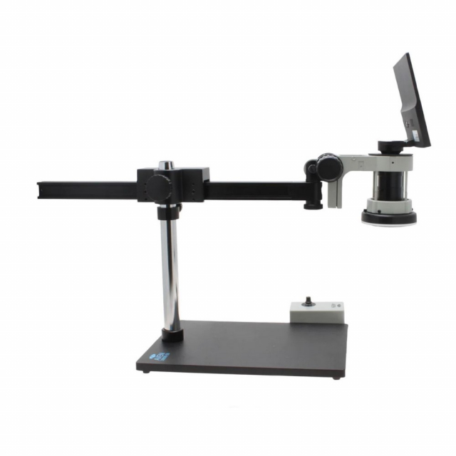 This gliding arm stand with a heavy metal base is an excellent device for inspection applications that require magnification adjustment and the ability to move easily across a specimen.