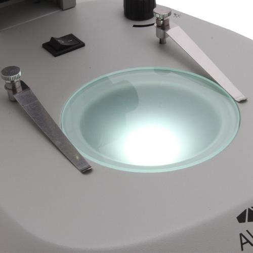 The overhead LED light shines bright light on the subject below the microscope. The light can be tilted to the desired angle