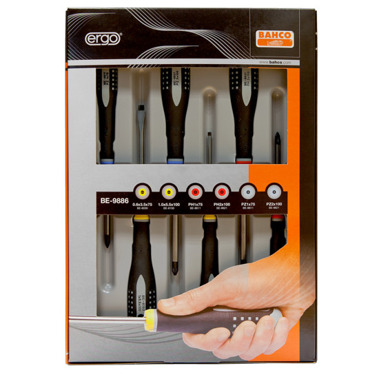 Bahco BE-9886 screwdriver set with 6 components of the highest quality assists in accomplishing a variety of tasks during assembly/disassembly of equipment or furniture and other maintenance & repairing challenges.
