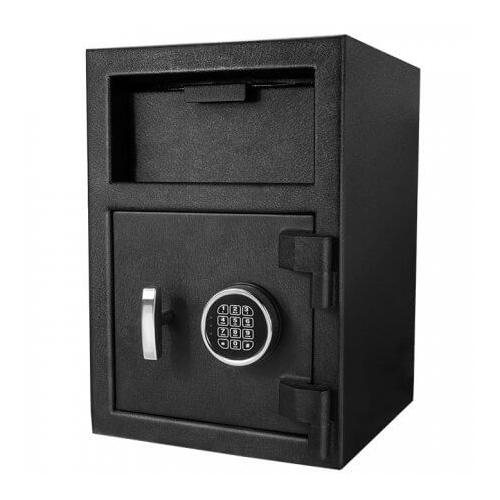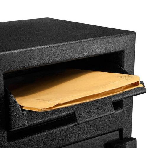 The DX-200 standard depository keypad safe by Barska is a heavy-walled steel deposit box intended for short-term storage of cash and is ideal for restaurants or any cash-business making regular bank deposits. The digital keypad can store up to two user-defined PIN codes. To resist tampering, this safe has a drop drawer with a row of jagged teeth that prevents deposited objects from being fished out, as well as a lock-out mode that deactivates the keypad. Pre-drilled mounting holes on the bottom of the DX-200 drop safe permit mounting with the included hardware.