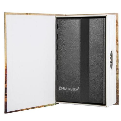 The Paris Book Lock Box with Combination Lock by Barska features a solid steel construction in a compact lightweight design. This compact safe is disguise to appear like a hard back†book. The interior features a strong compact steel safe. Easily portable design that can be stored and hidden in plain view for safekeeping. Features a resettable combination lock. Ideal for safely hiding valuables, storing money, passports, and jewelry.