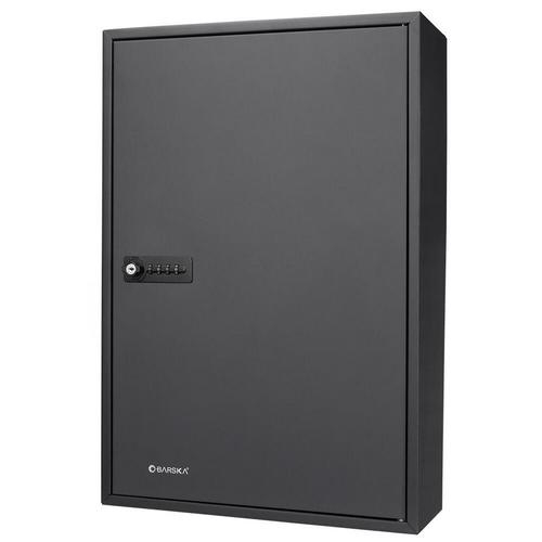 The 200 Position Key Lock Box from Barska (Black) features a hook-style cabinet that makes key organization easy and convenient. Inside the cabinet are a total of 20 rows of color-coded and numbered hooks, each of which is easy to access and keep track of thanks to the included key index. The two-sided indexing chart has ample room to document the keys hook position corresponding lock, and a drop-in plastic sleeve tethered to the hinge inside the safe provides a hands-free reference.The safe has four pre-drilled mounting holes and included hardware for installation.