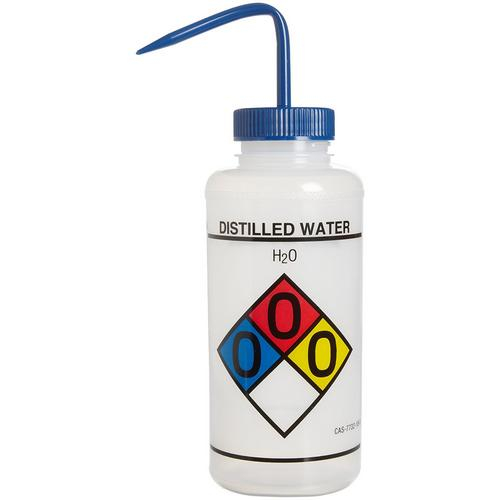 Right-to-Know Safety-Labeled Wash Bottles feature a 'Wide' mouth 53mm (2") for easy refilling. Bottles are pre-printed with the Chemical 'Name' and formula, the National Fire Protection Association (NFPA) Section 704 Four-color Diamond, health hazards, Chemical Abstract System (CAS) number, and suggested protective clothing and equipment.