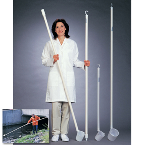 HDPE and HDPP dippers are chemical and corrosion resistant. Firm sampling bowl is welded to reinforced 29mm (1 1/8") diameter handle. The bowl is attached at a 45 angle for easier sampling from an elevated position. Choose from a variety of handle lengths all that have a hook at end for hanging storage. Available with a scoop end for sampling dry materials. Custom lengths and styles available. Per each Safely gather samples from tanks, vats, lakes, rail cars.