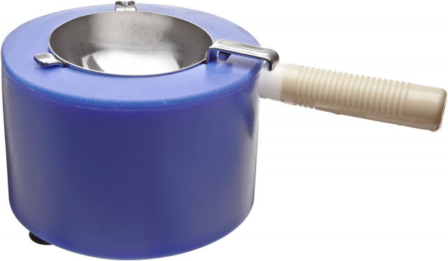 Grind frozen samples without liquid nitrogen hazards. This 304 stainless steel mortar is suspended by three brackets above a stainless steel bowl which holds liquid nitrogen. The bowl is nested in a heavily insulated blue polyethylene housing.