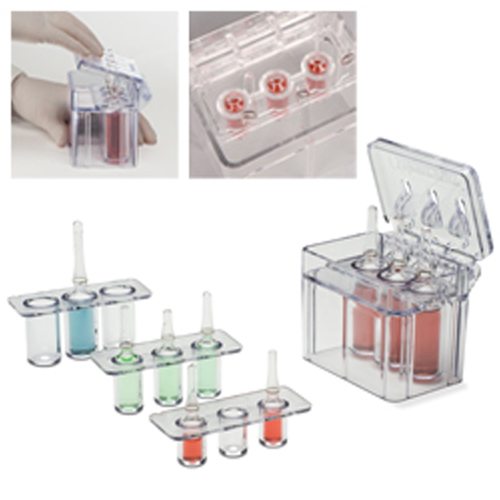 Box style design allows one handed opening of up to 3 ampules at a time by simply pressing down on lid. Ampule necks snap clean and are contained within the device while fingers stay away from sharp edges. After removing ampule contents, turn the device upside down over a trash receptacle to safely discard ampules and tops.