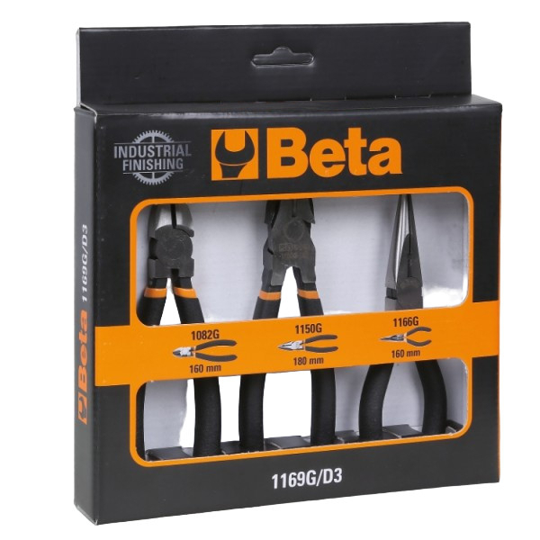 Beta Tools, 011690073, Set Of 1 Combination Pliers, 1 Long Needle Nose Pliers And 1 Diagonal Cutting Nippers, Slip-Proof Double Layer PVC, Industrial Finish