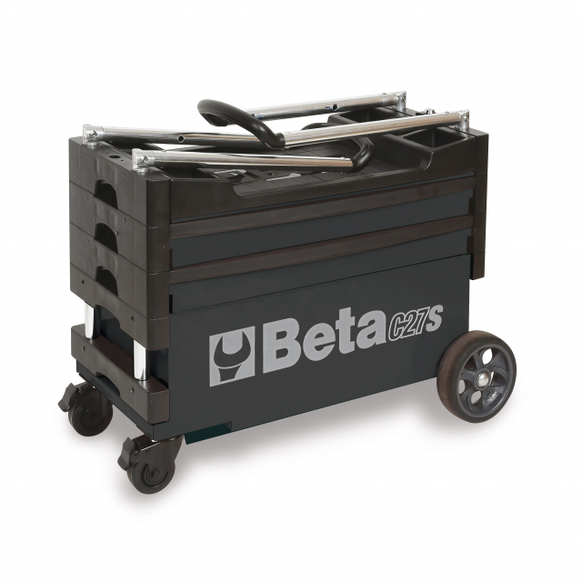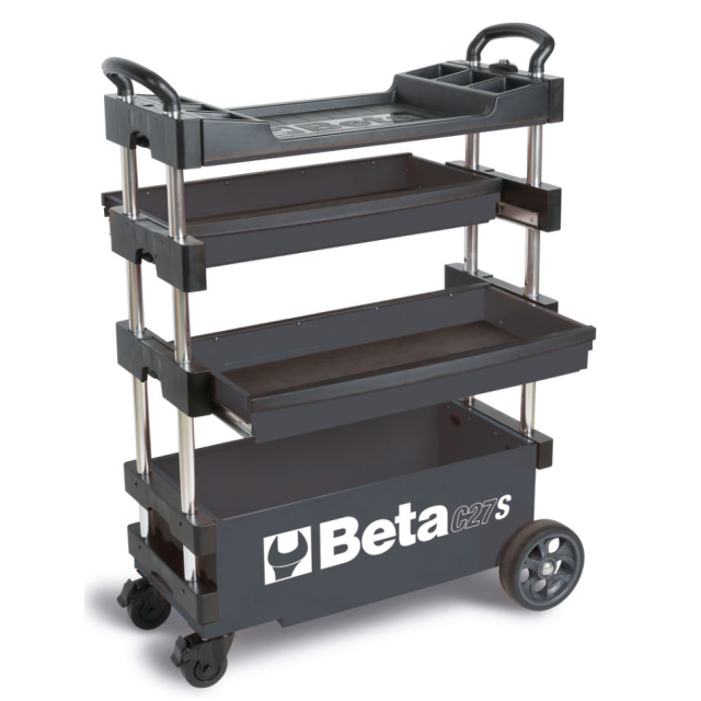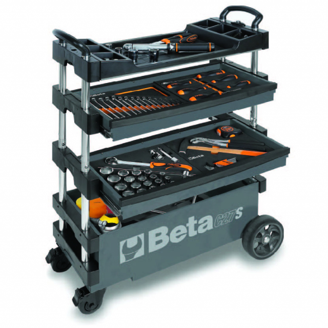 Transport tools with ease with Beta's C27S patented collapsible tool trolley, designed for both indoor and outdoor jobs. The 36" tall tool cart easily rolls across the shop floor, or racetrack and collapses to just 20" tall to haul your tools to any jobsite.