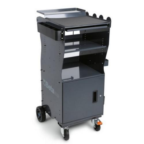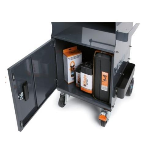 Can be used as a mobile workstation for diagnostic tools, laptops, testers and battery chargers, painted sheet metal frame: unparalleled firmness and sturdiness, ergonomic handle, 2-level top, pull-out drawer for housing a mini keyboard, 1 shelf with adjustable position, 1 fixed shelf and door, 4 useful side cable reels made of plastic, 2 useful side containers, 2 fixed rear castors dia. 160 mm, 2 steering front castors dia. 125 mm (one with frame), weight: 36.5 kg