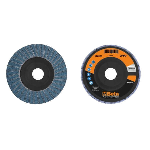 Beta Tools, 112020012, Flap Discs with Zirconia Abrasive Cloth, Plastic Backing Pad, Double Flap Construction, Flat, Premium Line, P 120