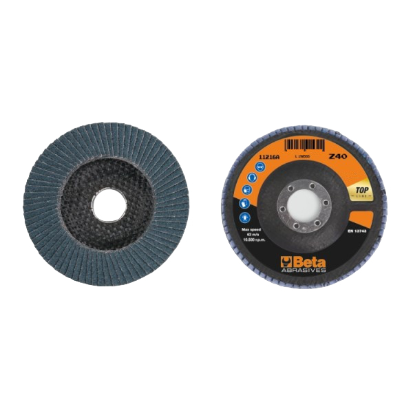 Beta Tools, 112160012, Flap Disc with Zirconia Abrasive Cloth, Fibreglass Backing Pad, Single Flap Construction, Flat, Top Line, P 120