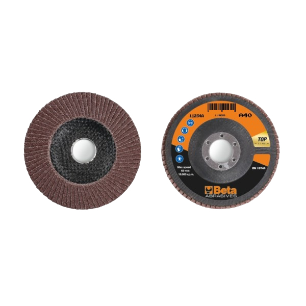 Beta Tools, 112340006, Flap Disc with Corundum Abrasive Cloth, Fibreglass Backing Pad, Single Flap Construction, Flat, Top Line, P 60