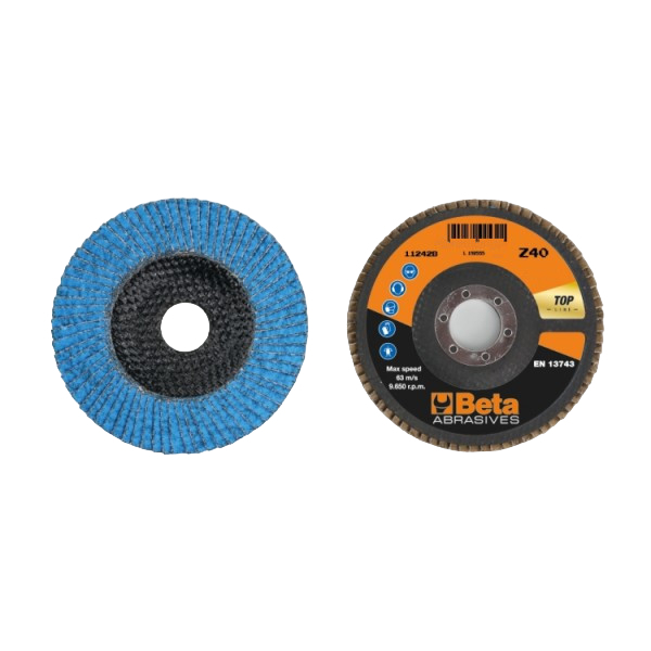 Beta Tools, 112420106, Flap Disc with Ceramic-Coated Zirconia Abrasive Cloth, Fibreglass Backing Pad and Single Flap Construction, Flat, P 60