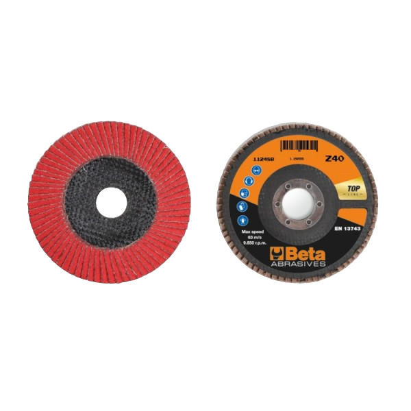 Beta Tools, 112480104, Flap Disc with Ceramic-Coated Abrasive Cloth, Fibreglass Backing Pad and Single Flap Construction, Flat, P 40