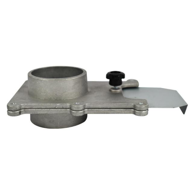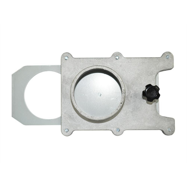 Blast gates are used to open and close branch ducts to divert the airflow only to those machines in operation. This conserves air volume and keeps suction strongest where dust is being produced, thus maximizing dust extraction. Outer case made from cast aluminum with sliding steel gate and locking knob. Typical gates allow debris to accumulate in the groove preventing the gate from closing fully, causing leaking and reducing suction. The slot on these units extends through the back of the base to allow debris to be pushed out of the groove and prevent buildup.