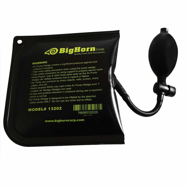 Big Horn 13202 Contractor-Grade Air Pump Inflatable Shim Bag. The Air Inflatable Shim Bag is made of extremely durable ballistic Nylon fabric and has a max load capacity of 300 lb. The 6" x 6.5" air cushion bag is 1/16" thick when deflated and 2-1/2" thick when inflated. 6" long tube 1-1/2"x 3" rubber bulb are attached and ready to use right out of the box. Hand operated pump gives maximum load of 300 lb. per bag inflates and deflates easily.