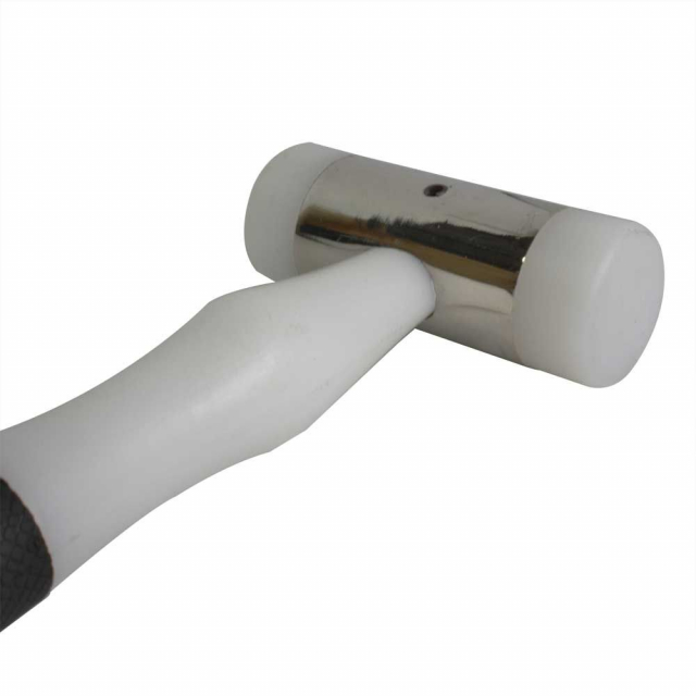 1-1/2" Nylon-Face Hammer feature quality. The replaceable faces are threaded for easy and secure installation. A shoulder absorbs the force of side blows and protects the threads. The zinc alloy head is serrated to ensure a tight connection with the faces, and chrome-plated for durability.