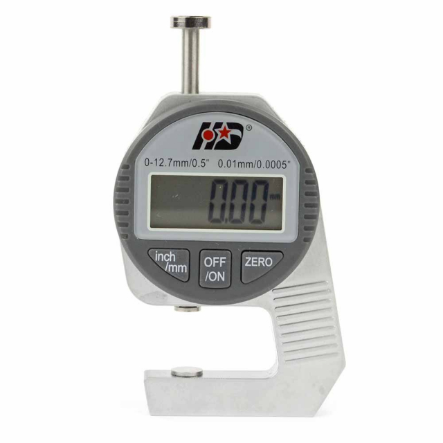 This high quality digital thickness gage is specifically designed to quickly and accurately measure the thickness of any thing that is up to 0.5" thickness. Featuring an easy to read LCD display with high accuracy. The user has the option to select thickness in inches or mm.