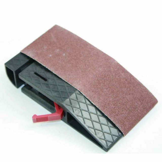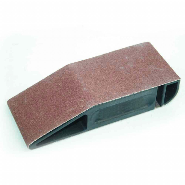 Big Horn 19519 Made from tough glass filled ABS plastic, It uses standard 2.5" x 14" sanding belts with a tensioning lever to keep the abrasive belt tight and flat. As the belt wears, simply rotate it around for fresh abrasive and then change the belt when spent. In addition to flat sanding, the ends are shaped to sand into tight corners and curved surfaces.