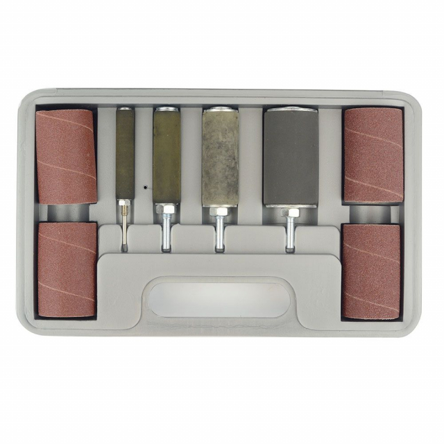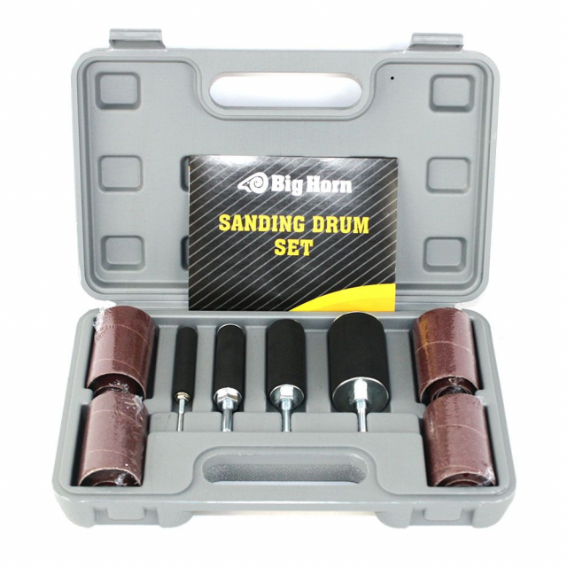 Big Horn 19521 Sanding Drum Set lets drill press do double duty as a spindle sander. You'll be ready for virtually every job with this quality set of drums and sleeves. Includes five expanding drums in sizes 1-1/2" by 2-1/2" , 1" by 2-1/2" , 3/4" by 2-1/2" and 1/2" by 2-1/2" . Also includes two sets of sleeves (two fine sets and two coarse sets). These drums will also work in hand drills for freehand sanding use. A selection of fpopular size rubber sanding drums complete with two 120 and 80 grit abrasive sleeves for each drum.