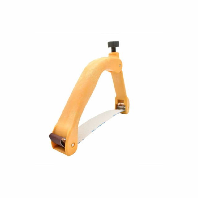 The sanding bow is great for sanding rounded contours, radiused corners or irregular shapes. Its comfortable bow-shaped handle takes the strain off your fingers and makes difficult sanding tasks feel like a walk in the park. Well-suited for a wide variety of sanding jobs, including curved table legs, carvings, and guitar, ukulele, and mandolin necks. A long stroke length of about a foot makes for fast sanding with less clogging.