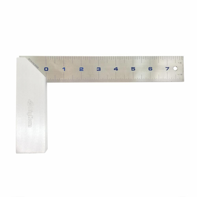 Big Horn etched stainless try square is easy to read and accurate with large, bold numbers and graduations. Solid Aluminum handle allows you quickly and accurately check for square, assess angles and mark cuts to ensure precise and aligned execution. Laser-etched scale for easy viewing, indexed in increments of 1/8" and 1/16".