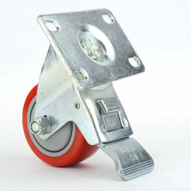 Swivel double lock caster moves safely and smoothly on hard surfaces or finished concrete, protecting floors and maintaining quiet transport. Double brake locks for both swivel and wheel rotation with an easy foot turn. Polyurethane tires are durable and do not flatten when sitting for Extended periods, ball bearings ensure smooth rolling, turning and swiveling.
