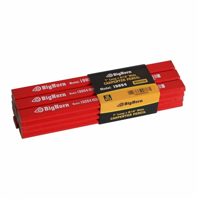 Big Horn 19854 High quality thick carpenter pencils are 7" long x 9/16" wide and made with strong flat lead. Sold as a 12pcs/pack wrapped in a color sleeve. Black hard lead. Outside red casing. These pencils are a durable marking tool that can be used in many applications including carpentry, and artistry..