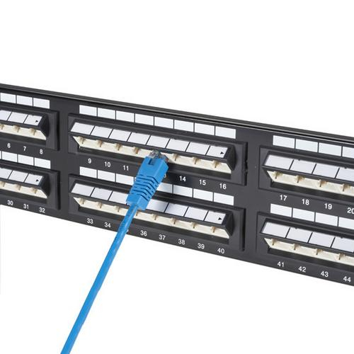 Save space and time in the data center with these 45° Angled-Port Patch Panels. The connectors tilt downward at a 45° angle making patching easier. Because the cables smoothly flow downward and don't protrude, you can save two, f, or more inches in front of every panel. You'll especially appreciate those extra inches when retrofitting cabinets with newer, deeper equipment. If you've run into situations where cabinet doors won't close or need to be removed to accommodate cable, you'll never go back to straight panels. Plus, because there is a nice downward cable flow, you can eliminate horizontal cable managers, saving a bundle of time and money. You also get the bonus of not having to worry about bend radius and strain relief.