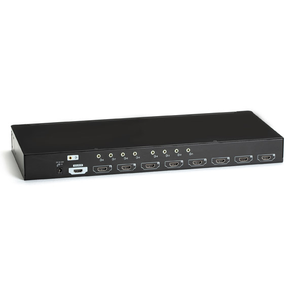 The 1 x 8 HDMI Splitter with Audio splits an HDMI source between up to eight outputs simultaneously without signal loss.