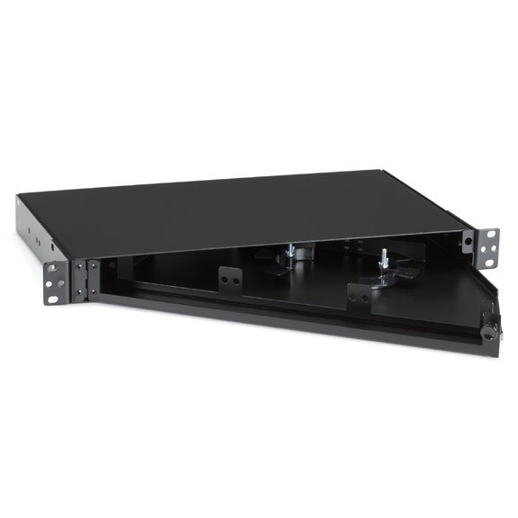 The adapter panels are recessed horizontally in the swing-out tray for superior patch cord protection. A splice tray stud enables you to install pigtail splice trays.