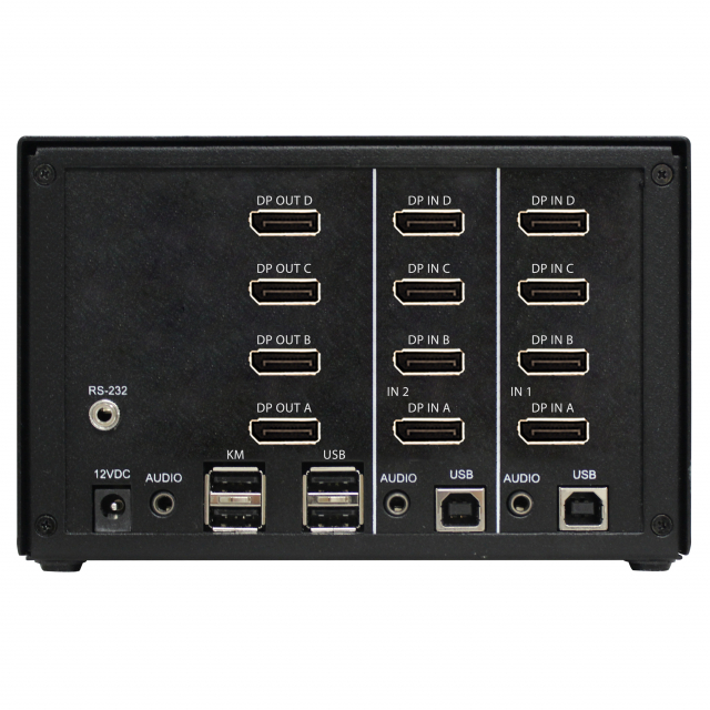 This dedicated multi-platform KVM switch manages 2 different computers through four DisplayPort monitors, one USB keyboard and mouse, a single set of speakers, and a USB 2.0 Device.
