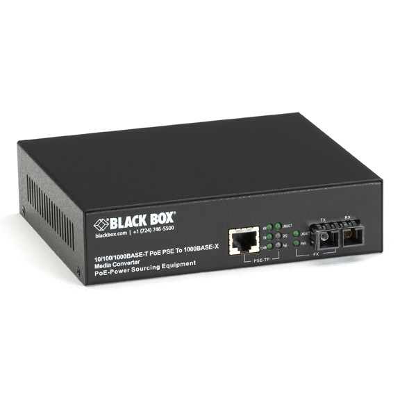 This PoE PSE Gigabit Media Converter from Black Box enables you to transparently connect copper cabling to multimode fiber as an economical way to extend Ethernet communications well beyond the 100-meter (327-foot) CATx limit.