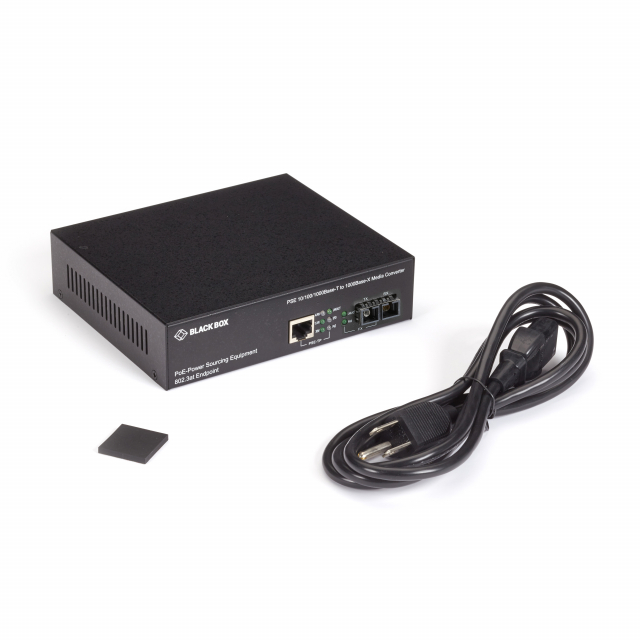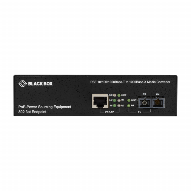 RoHS compliant. Connect Gigabit-speed fiber optic to a 10-/100-/1000-Mbps copper UTP segment while also powering 802.3af devices at the end of the CAT5 run. This PoE PSE Gigabit Media Converter from Black Box enables you to transparently connect copper cabling to multimode fiber as an economical way to extend Ethernet communications well beyond the 100-meter (327-foot) CATx limit.