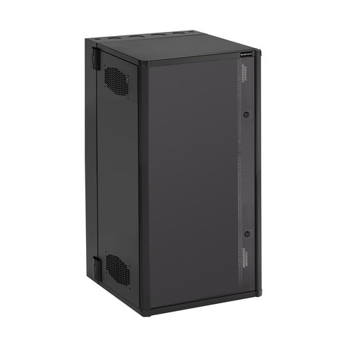 Its front panel is lockable and features a plexiglass window that provides superior scratch resistance, and which can be mounted to open from either the right or the left. The rack angles within the cabinet feature M6 square holes, and are adjustable to allow for mounting at various equipment depths. Separate rack angles can also be purchased with either 10-32 tapped or M6 square holes to provide additional mounting. The side panels are vented, providing tie-down points for cable management while also allowing for cross-flow air circulation that helps keep your equipment cool. If additional cooling is required, an optional 4-in. 100 CFM fan can be mounted on the side panels to help reduce heat.