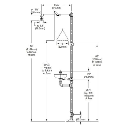 Combination Drench Shower and Eye/Face Wash Unit saves space and fits easily into any work environment. Shower valve operates quickly by a pull rod with a triangular handle. Shower provides a superior washdown with a more even spray pattern. Eye/ face wash operated by a large, highly visible push handle. Safe, steady water flow under varying water supply conditions from 30–90 PSI is assured by integral flow control in the sprayhead assembly. NOTE: The ANSI Z358.1 standard requires an uninterruptible supply of flushing fluid at a minimum 30 PSI flowing pressure. Eye/face wash sprayheads contain an antimicrobial agent to protect the sprayheads.