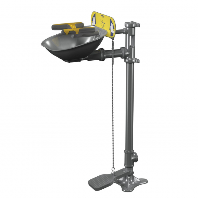 Bradley, S19214YFZS, Halo Pedestal-Mounted Eye-Face Wash, Stainless Steel Bowl, Hand/Foot Operated, SS Piping Pedestal Mount, European and Australian
