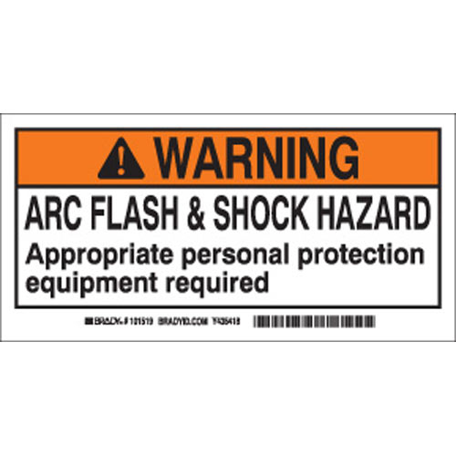 Brady, 101519, 2" x 4" Label with Legend: "WARNING Arc Flash & Shock Hazard Appropriate Personal Protection Equipment Required"