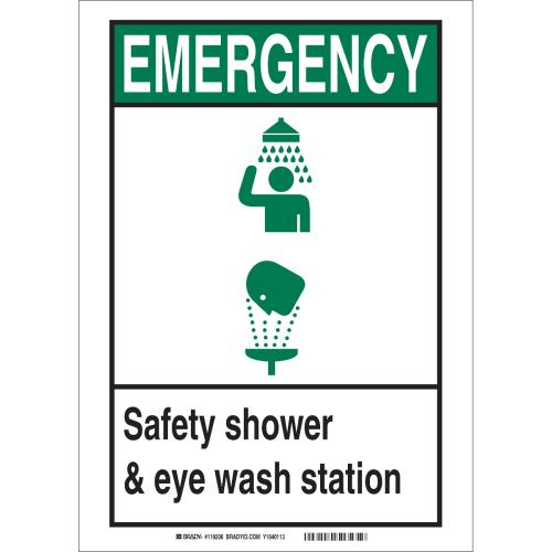 Brady, 119204, 7"x5" Emergency Safety Shower and Eye Wash Station Sign, Black/Green/White