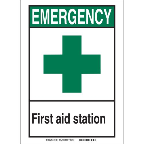 Brady, 119217, 7" x 5" Polyester Emergency First Aid Station Sign, Black/Green/White