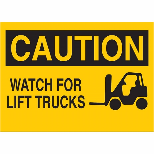 Brady, 122848, 7" x 10" Fiberglass Caution Watch For Lift Trucks Sign, Black on Yellow