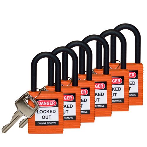 Brady, 123346, Orange Nylon Safety Padlock with 1.5" Shackle, 6 pcs (Keyed Alike)