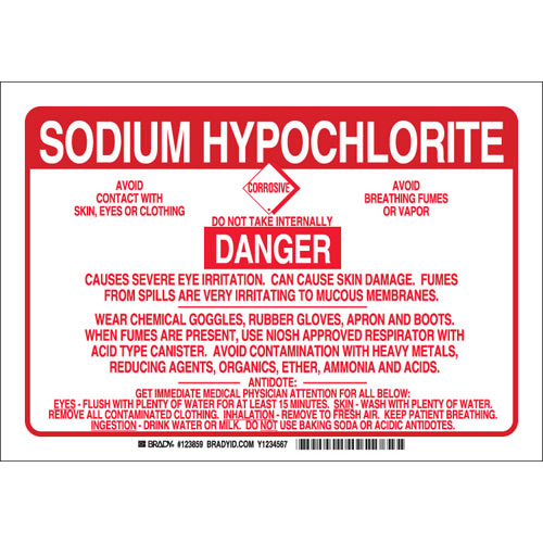 Brady, 123859, 7" x 10" B-302 Sodium Hypochlorite Danger Avoid Contact w/Skin... Sign