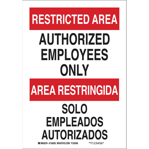 Brady, 124003, 10" x 7" B-302 Bilingual Restricted Area Authorized Employees Only Sign