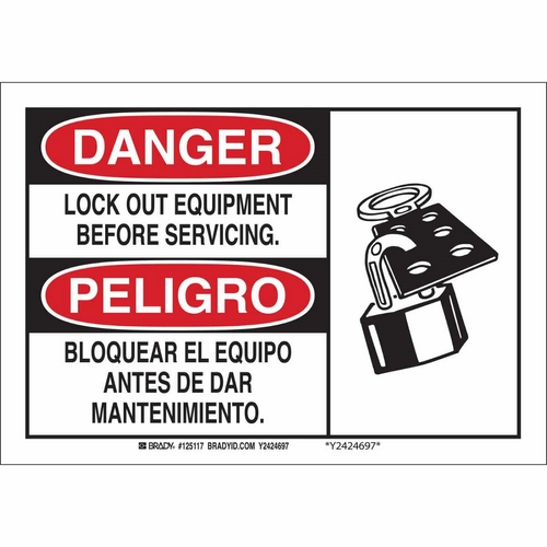 Brady, 125116, 7" x 10" B-401 Bilingual Danger Lock Out Equipment Before Servicing Sign